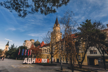 ZRENJANIN, SERBIA - NOVEMBER 23, 2019: Main square with the King Kralj Petar I statue and the city hall, Gradska Kuca, in afternoon. Zrenjanin is one of the main cities of Voivodina. Picture of the main square of Zrenjanin, Serbia, with the city hall and