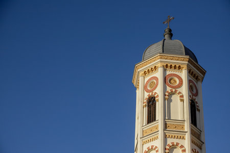 The bell tower rises prominently in Bucharest, Romania, featuring ornate designs and a beautiful contrast against the clear blue sky, highlighting the city's rich history.