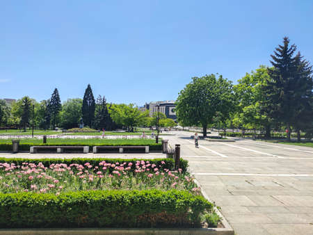 SOFIA, BULGARIA -MAY 11, 2020: Spring view of flower garden in front of National Palace of Culture, Bulgaria