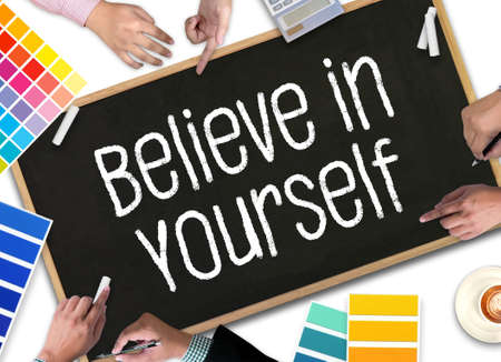 Modern board with text 'Believe in yourself', tablet, clipboard and sheet of paper on a white wooden surface, top view. Overhead.