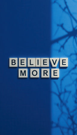 A visually striking image featuring the inspirational phrase Believe More on a vibrant blue background, complemented by intricate shadow patterns, perfect for motivation and positivity themes.