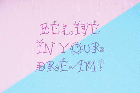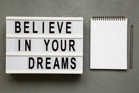 'Believe in your dreams' word on modern board, notepad over concrete background, top view. Flat lay, from above, overhead.