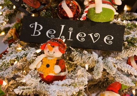 Beautiful Christmas tree Believe sign hanging on a pine tree as part of the holiday season