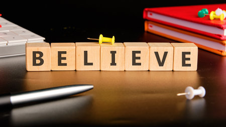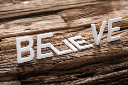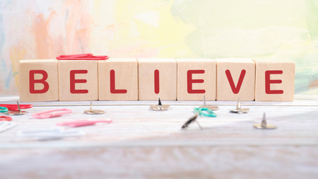 The concept word BELIEVE is made of wooden cubes on an abstract background. Business believe concept. Copy space