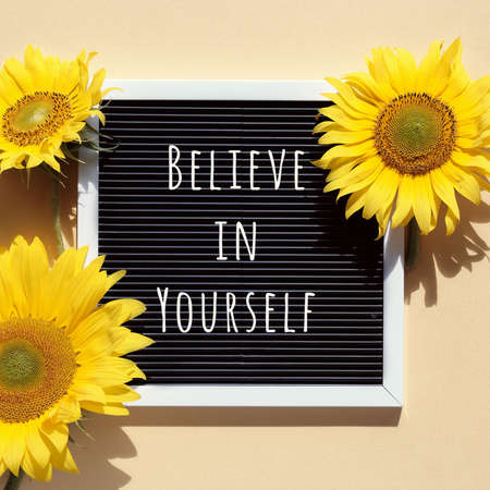 Believe in yourself, text on letter board with sunflowers. Flat lay with natural flowers and motivation message on black letterboard. Sunshine with long shadows.