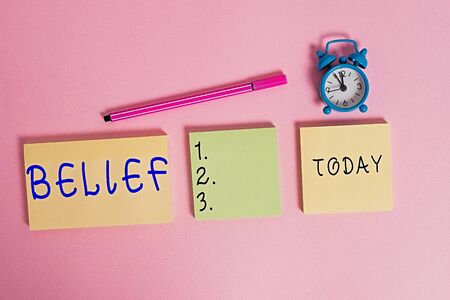 Word writing text Belief. Business photo showcasing the feeling of being certain that something exists or is true Three multicolor blank notepads alarm clock marker colored background