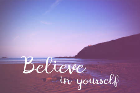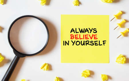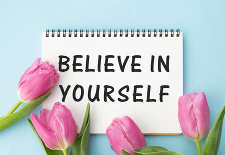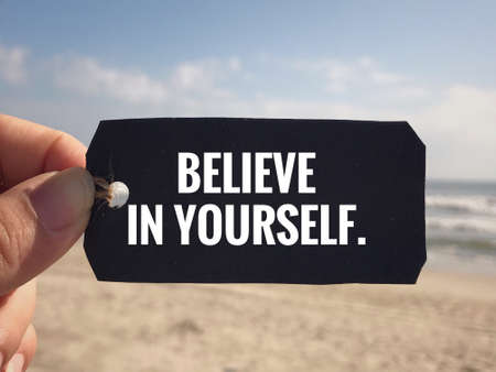 Motivational and inspirational quote - ‘Believe in yourself’ written on a black paper tag. Blurred vintage styled background.