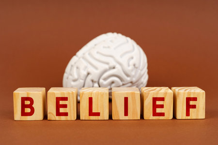 A wooden block arrangement spells belief in front of a white brain model, symbolizing the interplay between mental attitudes and neurological well-being.