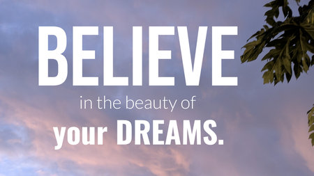 A motivational quote against a backdrop of a serene sky with a soft blue gradient and some green leaves on the top right. The text says "BELIEVE in the beauty of your DREAMS."