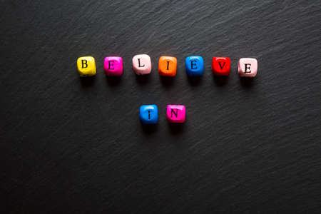 The words Believe in text on colorful wooden cubes, Black slate stone background with free space