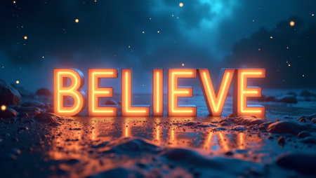 Glowing BELIEVE in 3D light letters with digital stars in dark blue mystical sky