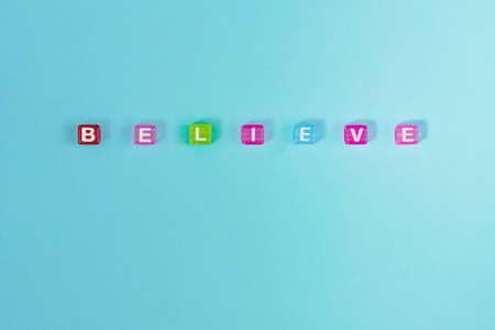 believe inscription made of colorful cube beads with letters. Festive blue background concept with copy space.