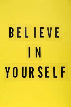 Believe In Yourself, words in wooden alphabet letters isolated on yellow background