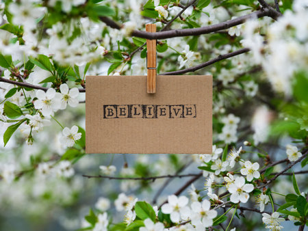 A piece of cardboard with the word Believe on it hanging on a cherry tree branch with blossoms using a wooden clothes pin.