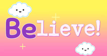 Digital image of text for children that reads believe. The background is a pink and yellow sky with smiling clouds and twinkling lights moving to the left 4k