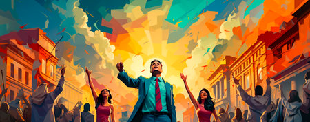 vibrant scene of human figures reaching towards radiant star, expressing hope and unity.