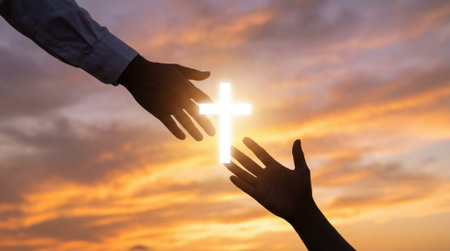 A symbolic image of one hand reaching down to another with a luminous cross between them against a sunset sky. Represents hope, faith, help from God, and spirituality.