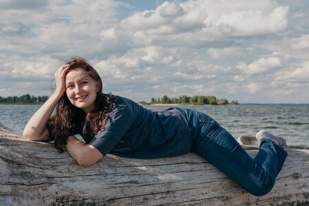 Nice girl with long red hair is standing on the background of a water surface. Portrait of a woman without retouching with her natural imperfections