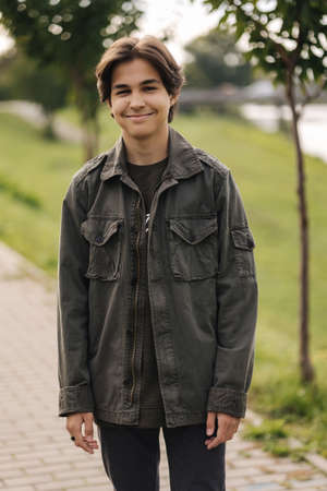 Happy teenage boy walking outdoor in the park in autumn time. Boy in khaki jacket