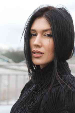Beautiful young girl in a black turtleneck sweater posing in the concrete wall,