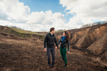 Dramatic portrait of a young brunette girl and a guy in cloudy weather. she's behind him. focus on the guy . selective focus, small focus area