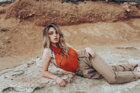 fashion outdoor photo of beautiful woman with blond hair in casual clothes posing on the summer beach