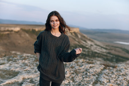 Woman in black sweater standing on hill with majestic mountain backdrop
