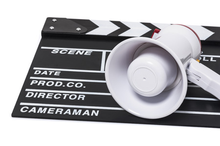Film director, producer concept. Electronic megaphone and clapperbord on yellow background top view.