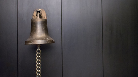 Copper old vintage bell. Decor concept element in the interior of a deck, cabin of a ship, restaurant, room, house, decorated on a marine theme