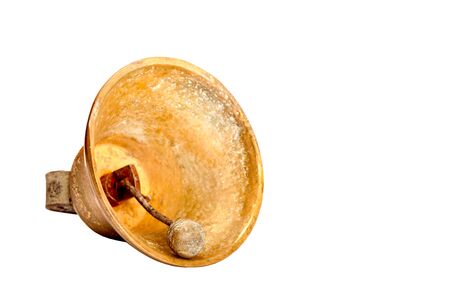 Old retro vintage antique copper brass bell on a white background. Clearing the space by ringing the bell according to the Chinese tradition of feng shui. Room or place for text