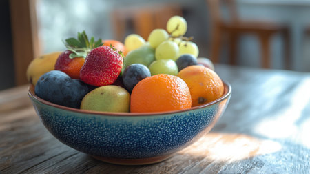 A vibrant arrangement of various fresh fruits in a decorative bowl, beautifully illuminated by sunlight, showcasing textures and colors perfect for a healthy lifestyle.