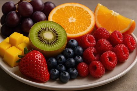 AI Image Fresh Colorful Fruit Plate with Kiwi, Berries, and Citrus