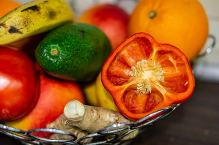 A closeup shot of fruits and vegetables in a vase with blurred background