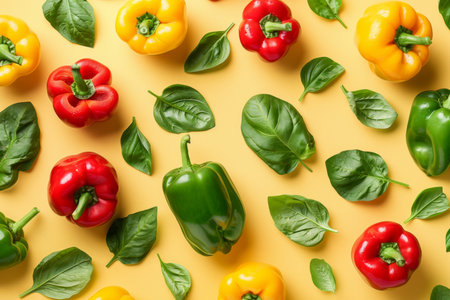 Colorful Bell Pepper Assortment A Flat Lay Pattern of Fresh Vegetables and Green Basil