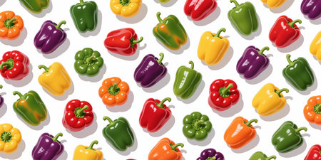 A colorful repeating pattern of cartoon-style bell peppers in red, orange, yellow, green, and purple, with green stems and shiny surfaces on a white background.
