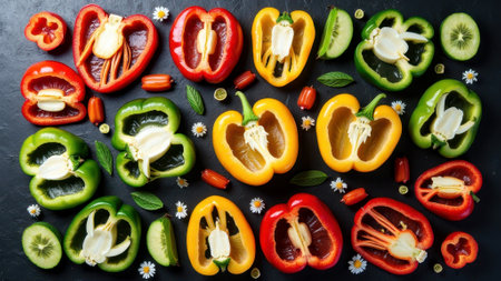 Colorful array of sliced bell peppers and fruits on black background. That the image is generated using AI.