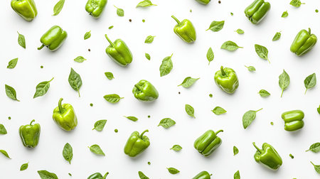A vibrant arrangement of fresh green peppers and leaves on a clean white background, perfect for food-related themes and healthy eating concepts.