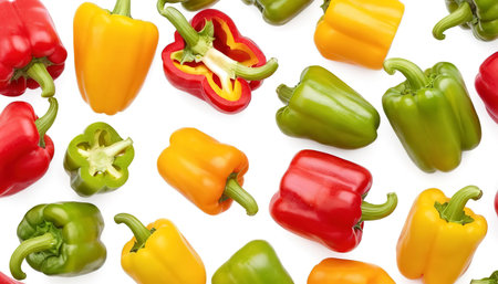 Top view of red and yellow sweet bell peppers isolated on a white background. Flat lay ideal for culinary and food imagery.