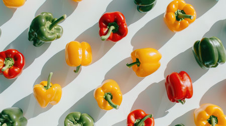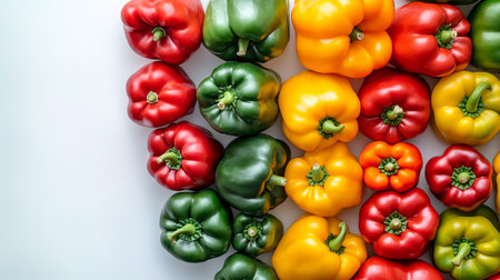 Top view of fresh bell peppers arranged in a pattern on a light surface, leaving plenty of space for text.