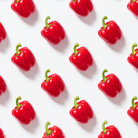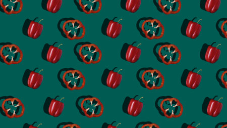 Vibrant repeating pattern showcasing whole and halved red bell peppers, ideal for food-related designs