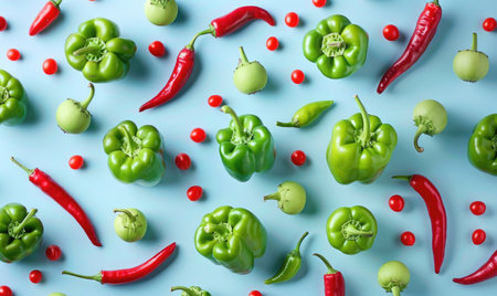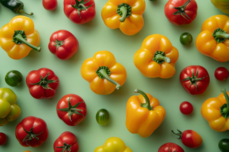 Colorful bell peppers and red tomatoes pattern on pastel green background, top view