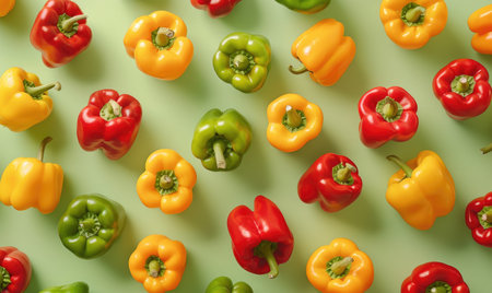 Top view of colorful bell peppers on a pastel green background