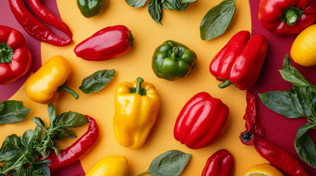 A colorful arrangement of red, yellow, and green bell peppers with fresh basil leaves on a bold red and yellow background, highlighting freshness and vibrancy.