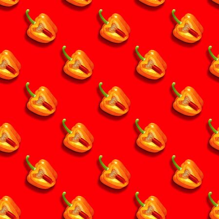 Orange pepper seamless pattern on orange background. Vegetable pattern for design. Abstract food background. Top view, flat lay.
