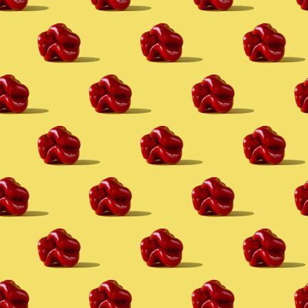 Seamless pattern of red ugly pepper on yellow background. Front view.