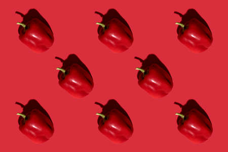 Red pepper seamless pattern on a red background. Vegetable pattern for the print. Abstract food background. Top view, flat lay.