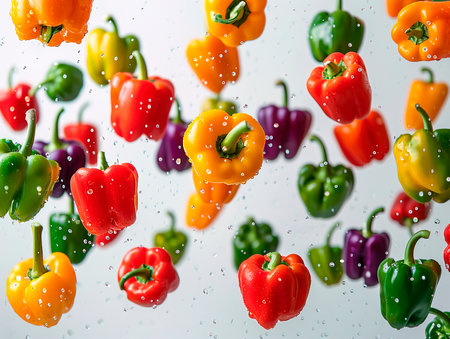 Set of Flying bell peppers isolated on white background. photography of BELL PEPPERS falling from the sky, hyperpop color scheme. glossy, white background