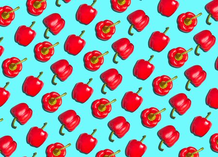 Set of red bell peppers on a blue background. Pattern from red peppers, healthy food concept.