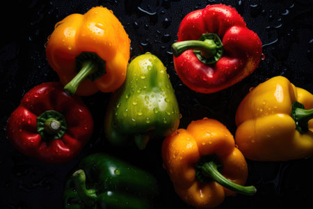 red, green, yellow, and orange peppers against a sleek black background, the visual appeal and create a captivating culinary tableau