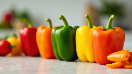 Fresh bell peppers in vibrant colors, including red, green, yellow, and orange, arranged neatly on a kitchen counter, offering a variety of culinary possibilities for healthy meals